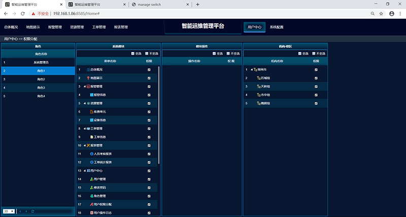 3.8 用戶中心模塊:支持為不同的角色分配不同的權限,允許訪問那些模塊,允許操作那些模塊,允許訪問那些機構的的數據信息,支持將角色賦予不同的用戶