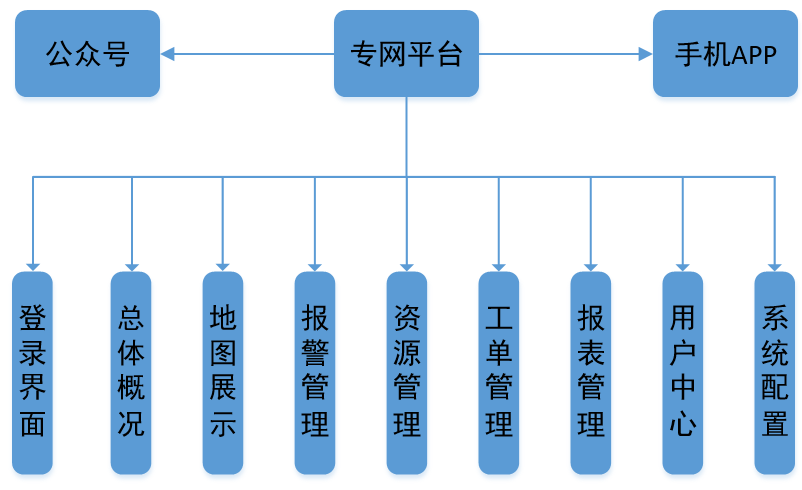 智能運維平臺功能結構包含登錄界面、總體概況、地圖展示、報警管理、資源管理、工單管理、報表管理、用戶中心、系統配置九大模塊,如圖1.2所示: