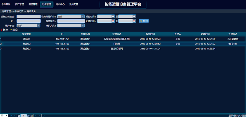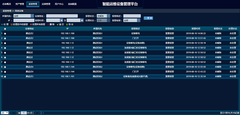 3.5 報警管理模塊:顯示所有設備故障信息,包括故障內容,報障日期,處理狀態。基于前端不同硬件設備,告警內容包含:電口失去連接告警,市電欠壓/高壓告警,漏電告警,設備掉電告警,市電掉電告警,斷網(斷纖)告警,相機死機告警,相機掉電告警,門打開告警,水浸告警,補光燈異常告警等;支持郵件或手機APP派單
