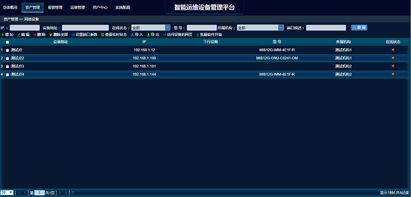 3.3 資產管理模塊:列表形式展現所有被管理設備信息,在線狀態、支持設備信息查詢、導出,批量添加、升級設備